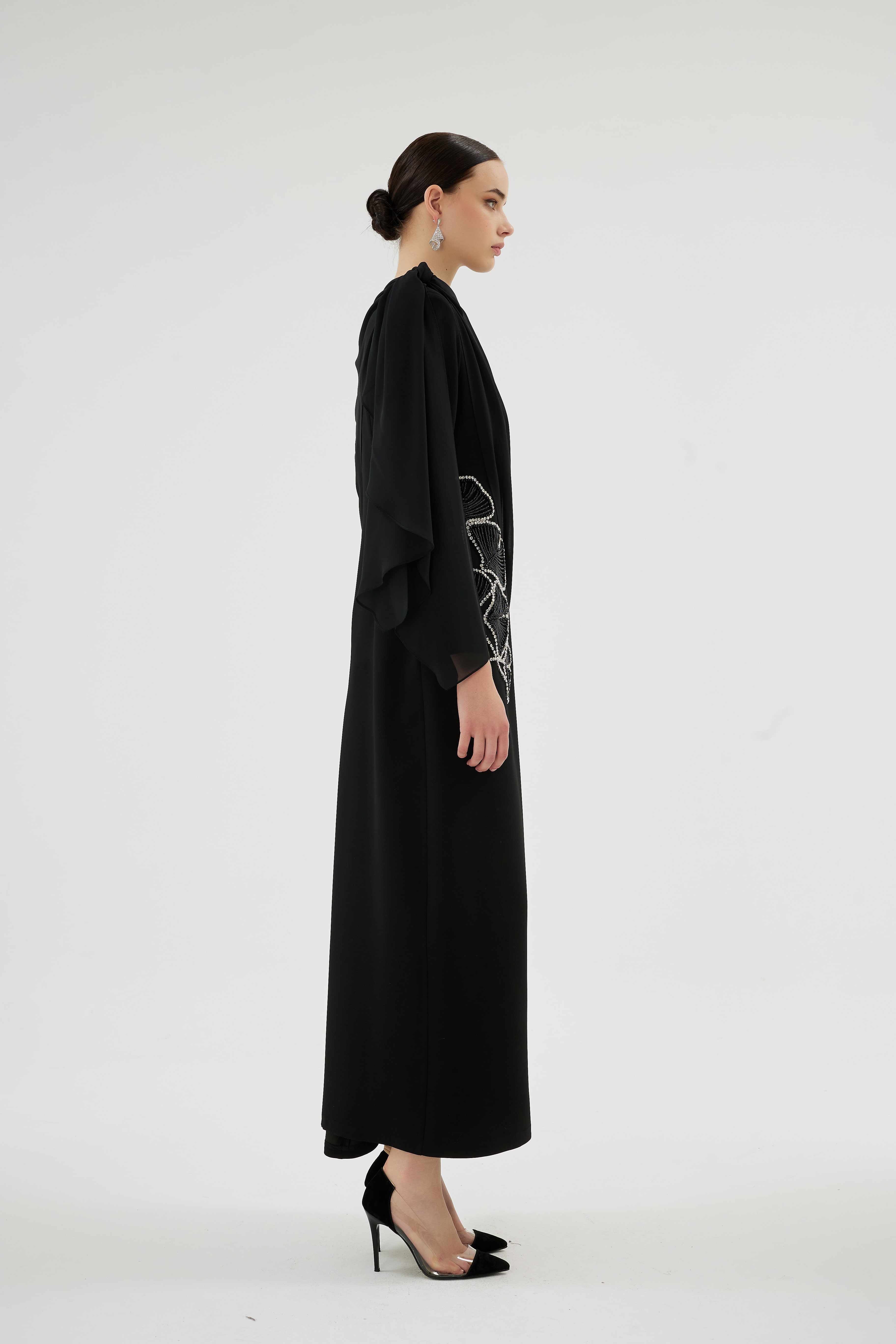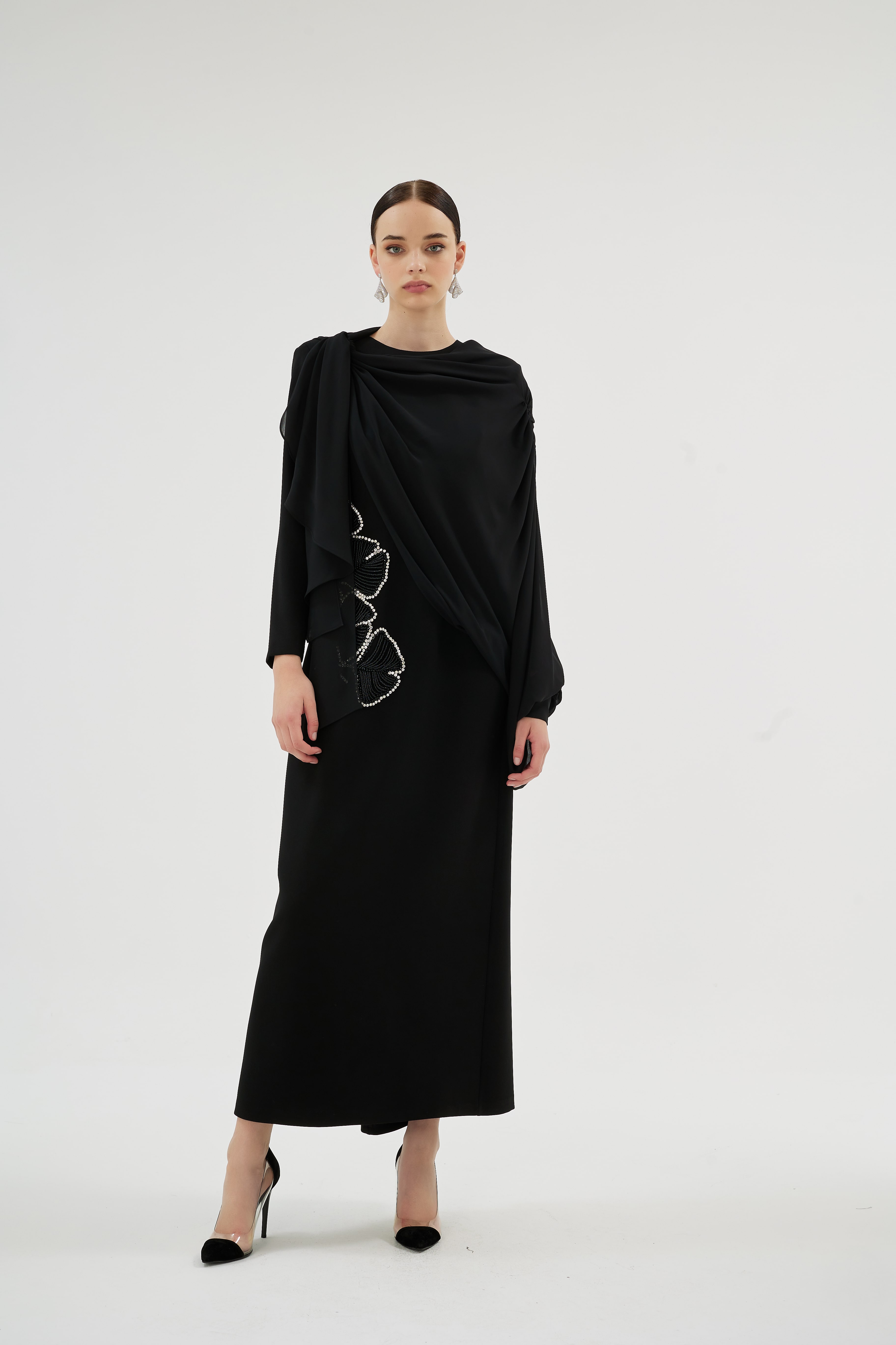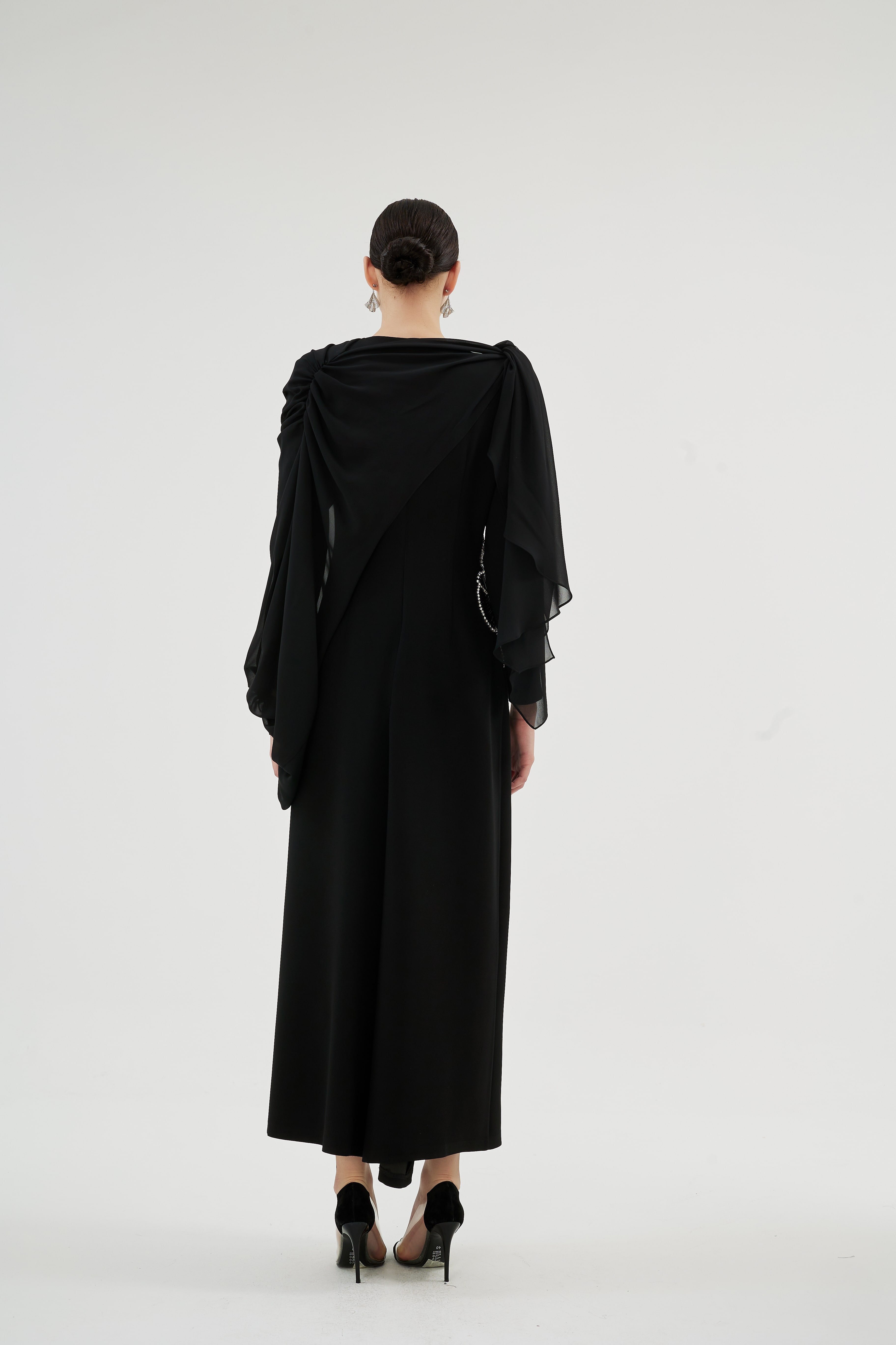 Krep kumaş ve özel el işçiliğiyle tasarlanan bu elbise, seyyar şifon kol detaylarıyla sofistike bir şıklık sunuyor.